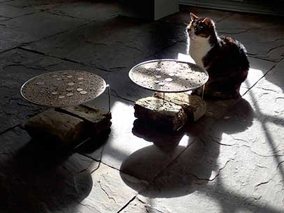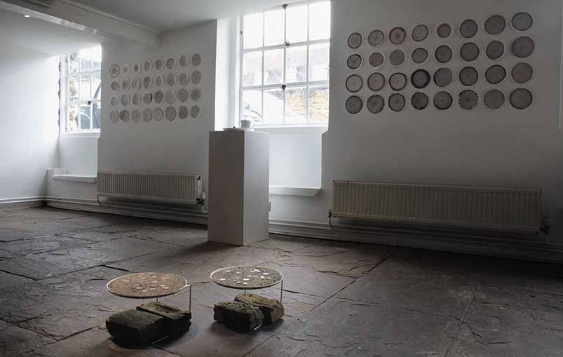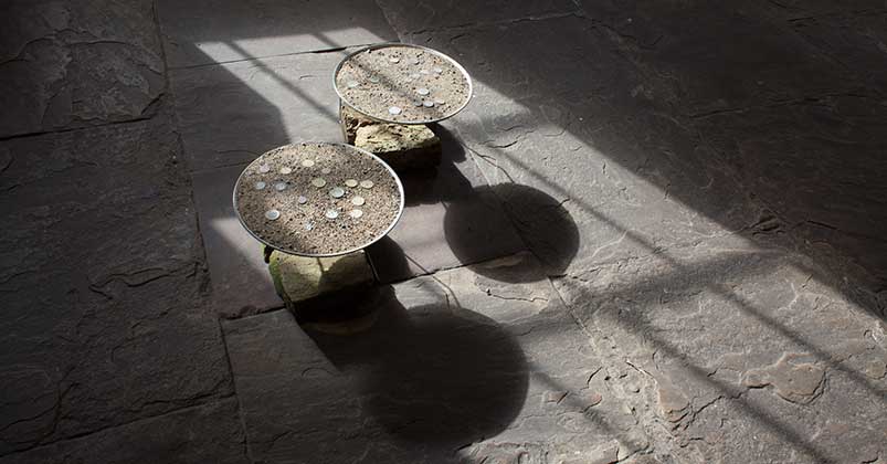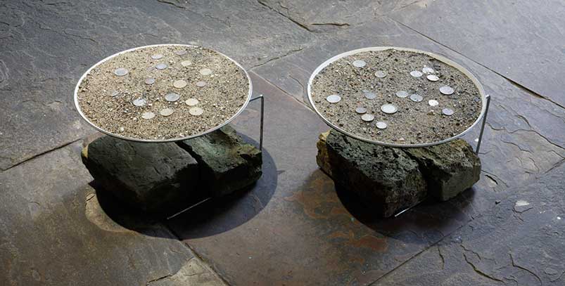 Chunks of Thames mud were levelled on two shallow platters, and a selection of coins was placed on the layers of mud and sand. One of the platters carried sterling pounds and pennies whereas the second one was set with euro coins and cents. The platters with coins on were left outside for a few weeks. Exposed to rain showers, the mound wore down and eroded around the coins leaving behind pillars of sand protected by the coins. The platters were exhibited in the Lower Space gallery of the former Lambeth Ragged School, a Victorian building erected in the middle of a riverside slum. The installation was accompanied by video footage of tide receding shot on the foreshore nearby Lambeth Bridge.