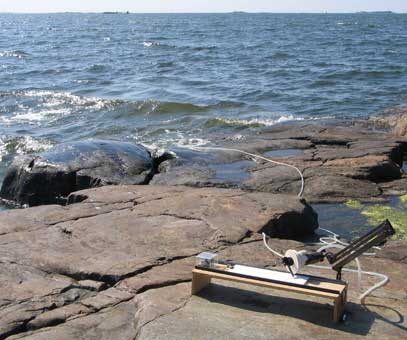Wave tracer traces the pulse of the sea. The instrument consists of two funnels covered with flexible rubber membranes and connected with a hose. When one of the funnels is placed underwater, changes in water pressure are reflected to the other one with a pen attached so that the movement is translated into a graph while a string-driven little sledge pulls the paper.