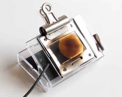 Meteorologist Vincent J. Schaefer (1904-1993) devised a method for recording raindrops' collision with glass. A 35 mm glass slide is rubbed with silicone oil and coated with a thin layer of soot. When a drop of rain hits the surface, air trapped under the droplet lifts tiny bubbles of soot resulting in explosion like patterns on the slide. I adapted Schafer’s method to my purposes and added a contact microphone to catch the sound of the collision. A video projection shows the formation of the splashes. The patterns are also scanned and printed on paper.